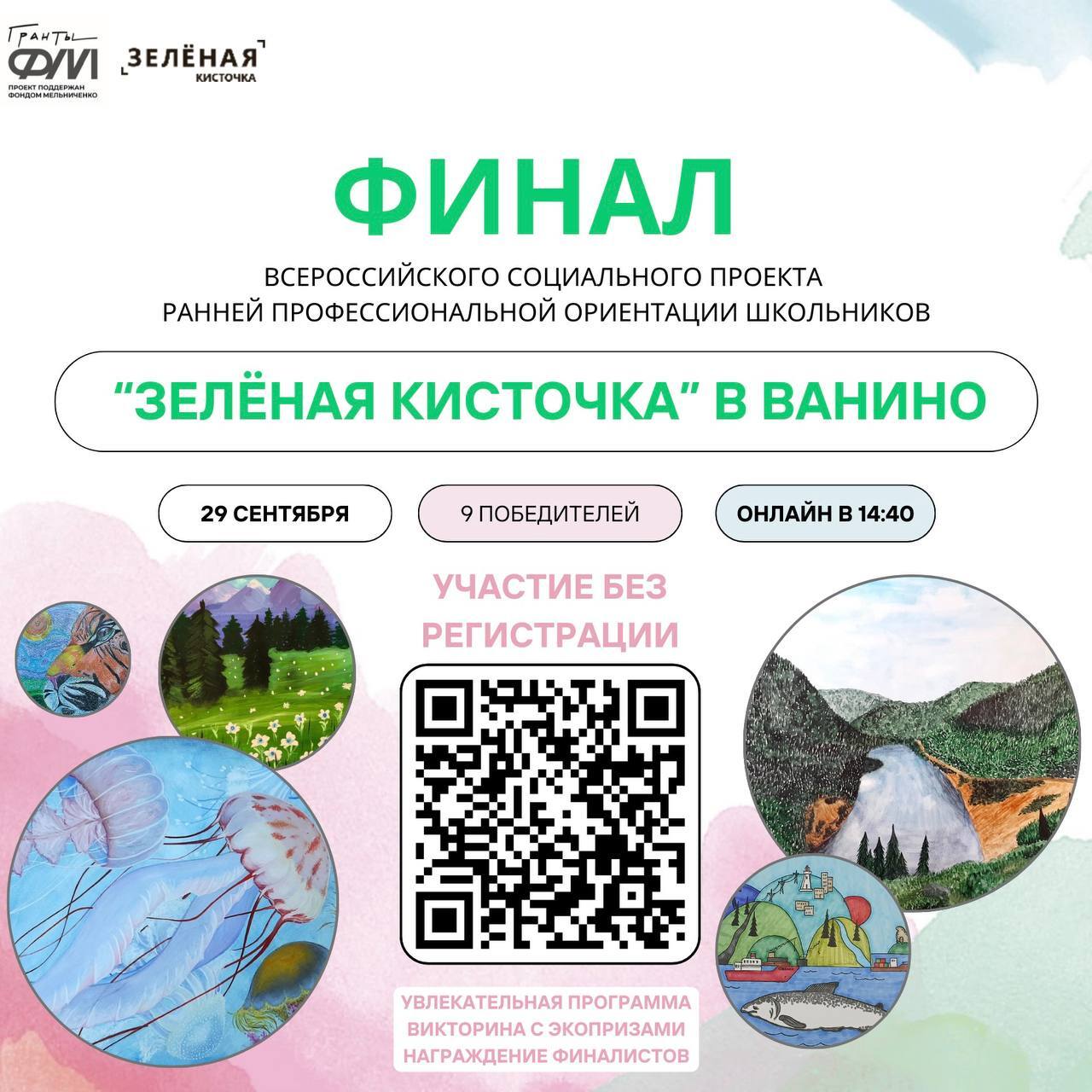 29 сентября состоится торжественный финал конкурса «Зеленая кисточка». Гости мероприятия смогут своими глазами увидеть работы победителей конкурса, принять участие в тематической викторине с призами, узнать об экологических и культурных инициативах, которые прямо сейчас развиваются в Ванино силами волонтеров и неравнодушных людей. Все желающие получить ссылку на трансляцию финала могут обратиться к организаторам, отправив запрос по адресу info@зеленаякисточка.рф